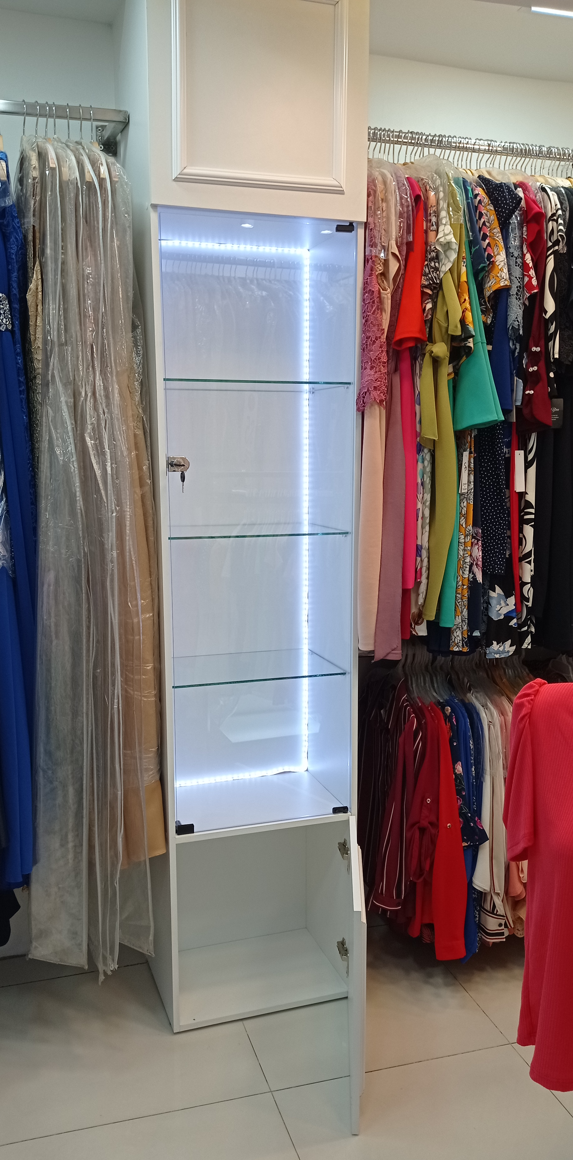 - Iluminación de Acento: Se diseñó una vitrina a medida con iluminación LED integrada y repisas de vidrio para exhibir bisutería y accesorios de alto valor, creando un punto focal de atracción.